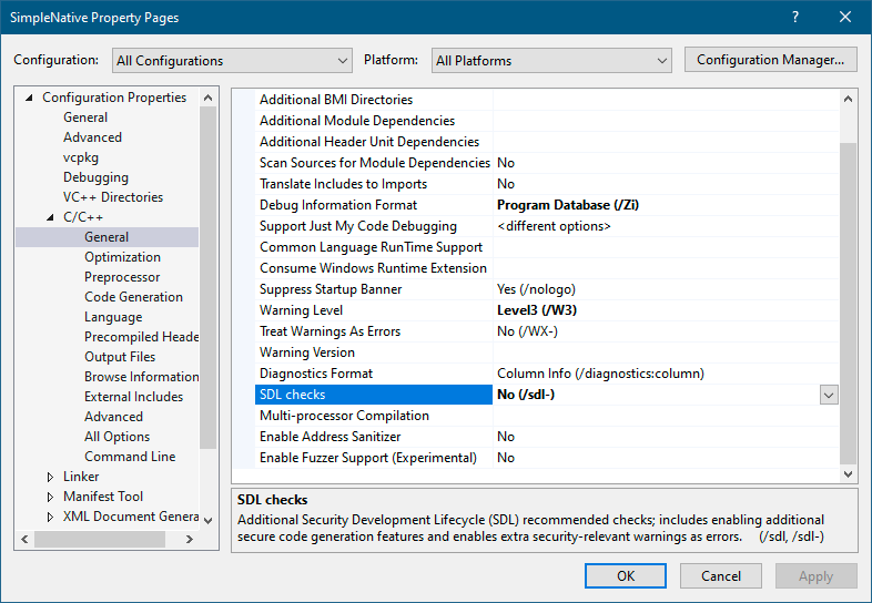 - 导航到**“C/C++”** -> **“常规(General)”**节点。将“SDL检查(SDL Checks)”设置为“否(No)”。将“调试信息格式(Debug Information Format)”设置为“程序数据库(Program Database)”。见图3-12。