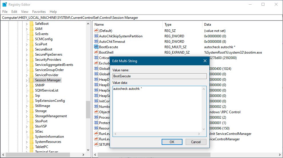 多字符串值中的每一行都包含可执行文件名称和命令行参数。AutoChk获得了特殊处理,并拥有一个友好名称用于标识。从图3-7中可以看到,“autocheck”是友好名称,“autochk *”是可执行文件名称和命令行参数。该可执行文件必须位于System32目录中——不支持完整路径。这是有意设计的,因为默认情况下,向System32目录写入文件需要管理员权限。注册表项本身也仅允许管理员账户进行写入操作,以进一步限制普通用户随意修改该键值。