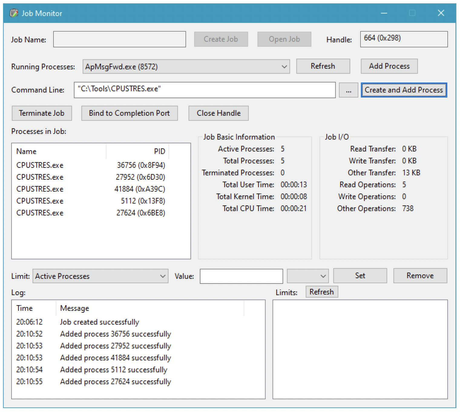 auto hJob2 = ::CreateJobObject(nullptr, L"Job2");