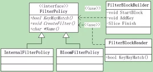 因名知意,FilterPolicy是用于key过滤的,可以快速的排除不存在的key。前面介绍Table的时候,在Table::InternalGet函数中有过一面之缘。 FilterPolicy有3个接口: