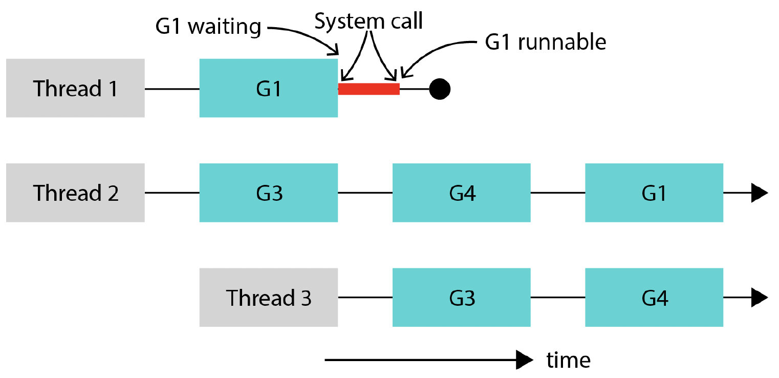 图2.2展示了这种情况。假设GOMAXPROCS = 2。线程1和线程2是正在执行goroutine的操作系统线程。在线程1上运行的goroutine G1执行一个同步I/O操作,阻塞了线程1。由于线程1不再可用,Go运行时会分配线程3并继续运行goroutine。请注意,即使有三个操作系统线程,但只有两个是活动线程,一个是阻塞线程。当在线程1上运行的系统调用完成后,goroutine G1再次变为可运行状态,但现在多了一个线程。Go运行时会继续使用线程3运行,不再使用线程1。