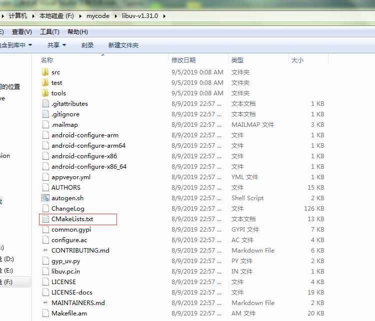从 libuv 的官方地址提供的下载链接:https://dist.libuv.org/dist/ 下载最新的 libuv 的源码得到文件 libuv-v1.31.0.tar.gz(笔者写作此书时,libuv 最新版本是 1.31.0),解压该文件。作者的机器上我将代码解压至 **F:\mycode\libuv-v1.31.0\ **,解压后的目录中确实存在一个 CMakeLists.txt 文件,如下图所示: