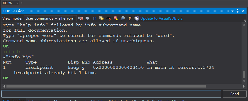 我们的程序会自动停在main函数处,这样我们就能利用强大的Visual Studio对redis-server进行调试了。当然读者也可以在VisualGDB 提供的GDB Session窗口直接输入gdb的原始命令进行调试。