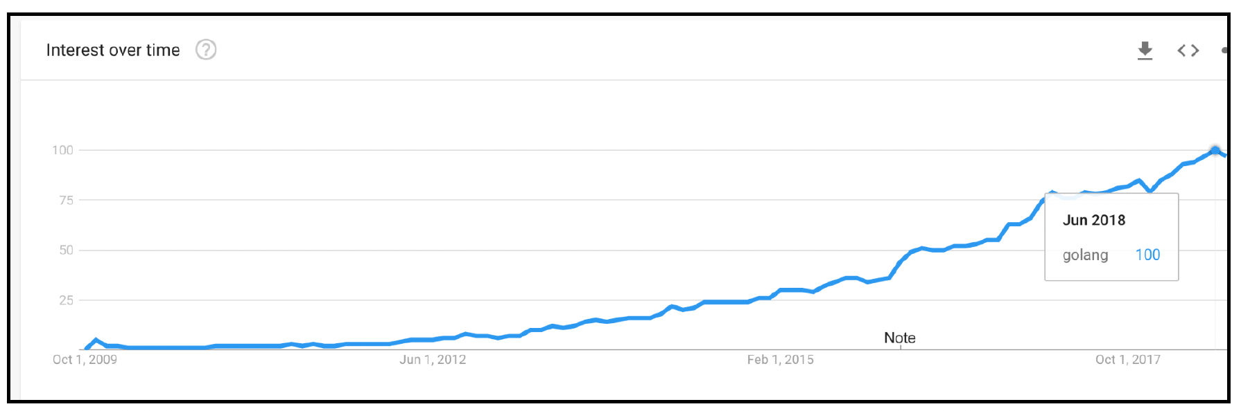 自诞生近九年以来,Go语言的受欢迎程度持续上升。下面的谷歌趋势图很好地展示了人们对这门语言的兴趣呈指数级增长: