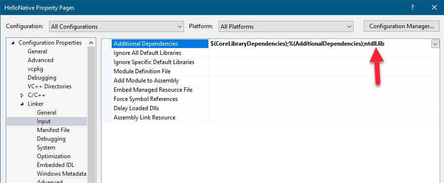 注意,代码中可以使用STATUS_SUCCESS(值为0)进行比较,因为该常量已在phnt头文件中正确定义。另外,链接仍然是开发人员的责任。上述示例使用#pragma指令向项目添加了NtDll.lib依赖。