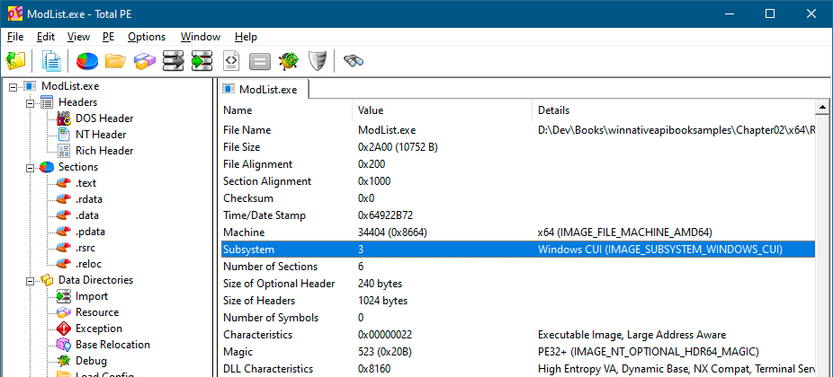 查看普通可移植可执行文件(Portable Executable,PE)的头部(例如Explorer.exe、Notepad.exe以及前几章的示例),会发现它们属于Windows子系统(Windows Subsystem)。控制台应用程序的子系统值为3(图3-1),图形用户界面(GUI)应用程序的子系统值为2(图3-2)。