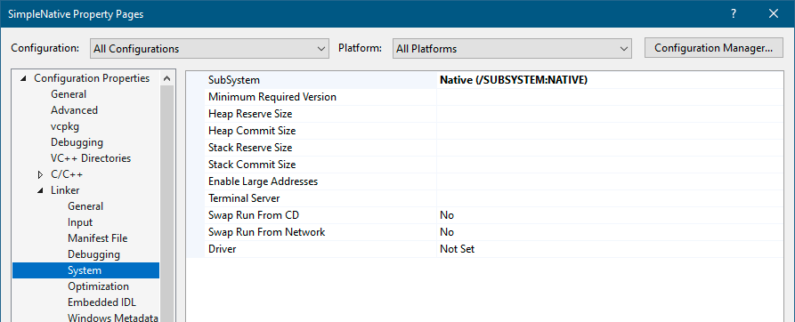 - 导航到**“链接器(Linker)”** -> **“系统(System)”**节点,将“子系统(Subsystem)”更改为“原生(Native)”(图3-10)。