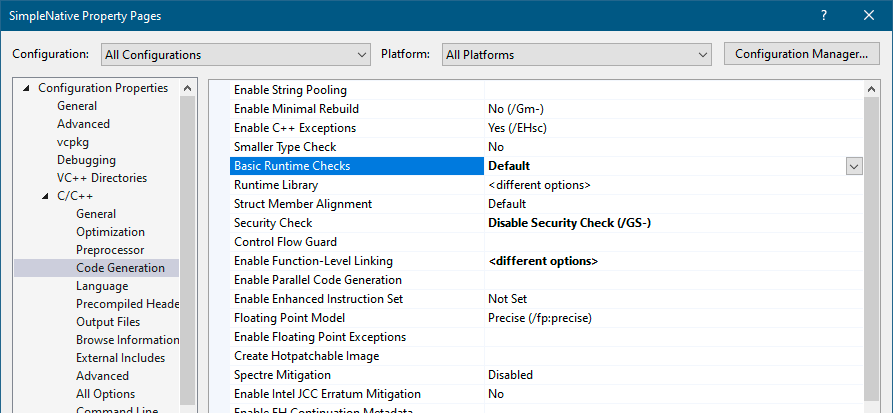 - 导航到**“C/C++”** -> **“代码生成(Code Generation)”**节点。将“基本运行时检查(Basic Runtime Checks)”设置为“默认(Default)”,这实际上会关闭运行时检查。这是必需的,因为这些检查由C运行时库(CRT)提供。