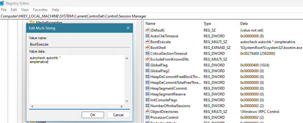 多字符串值中的每一行都包含可执行文件名称和命令行参数。AutoChk获得了特殊处理,并拥有一个友好名称用于标识。从图3-7中可以看到,“autocheck”是友好名称,“autochk *”是可执行文件名称和命令行参数。该可执行文件必须位于System32目录中——不支持完整路径。这是有意设计的,因为默认情况下,向System32目录写入文件需要管理员权限。注册表项本身也仅允许管理员账户进行写入操作,以进一步限制普通用户随意修改该键值。