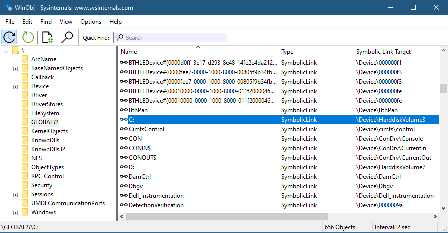 这个奇怪的“??\”是什么意思?它是对象管理器(Object Manager)命名空间中的一个目录,用于存储符号链接(symbolic links),其中之一就是“C:”。你可以使用Sysinternals的WinObj工具或我自己的Object Explorer来查看所有这些内容。图3-15显示WinObj正在显示“\Global??\”目录(“??\”的另一个名称)。它还显示了这个符号链接的目标:“Device\Harddiskvolume3”(在你的系统上可能有所不同)。