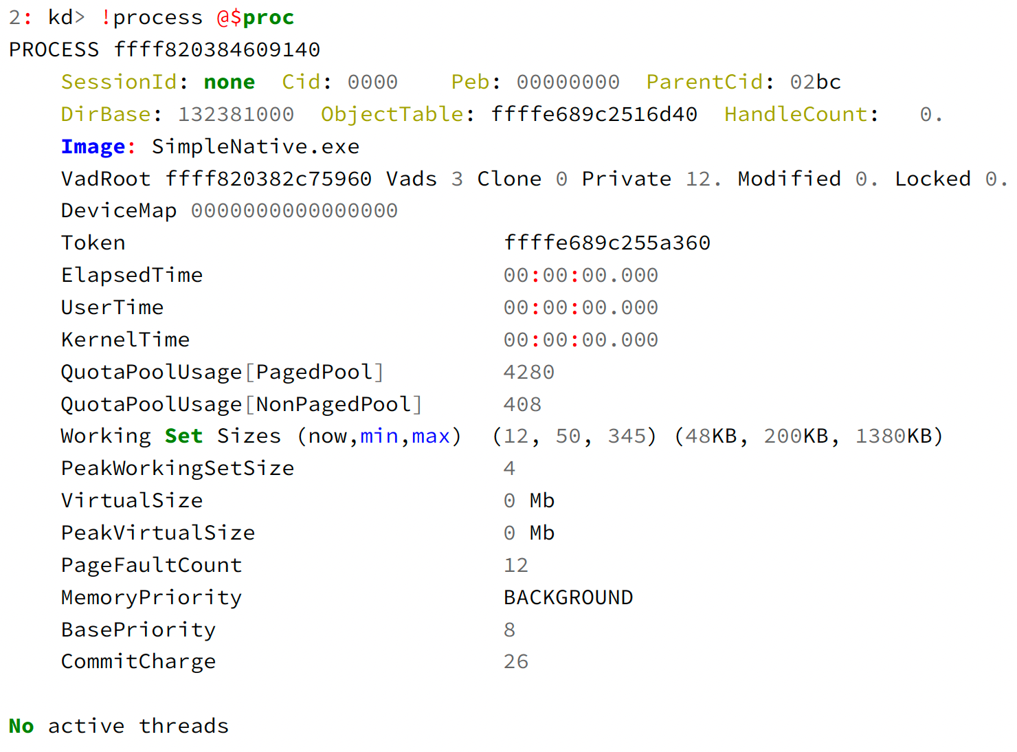 在断点处,进程(几乎)已创建。实际上,!process 0 0命令不会显示该进程。不过,你可以使用!process @$proc或!process -1查看其基本信息,因为它是当前进程: