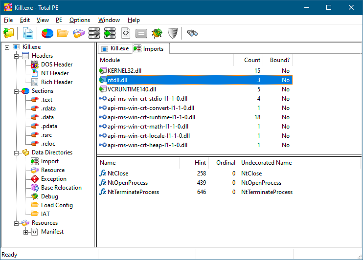 查看此类可执行文件的依赖项时,可能会在PE导入目录(Imports PE directory)中看到或看不到NtDll.dll,但这种依赖关系始终存在(尽管是间接依赖)。查看第2章中Kill.exe(Release版本)的导入目录,会发现它依赖于Kernel32.dll、NtDll.Dll和VCRuntime140.Dll。选择特定的动态链接库(DLL),会在底部显示导入的函数(图3-3)。