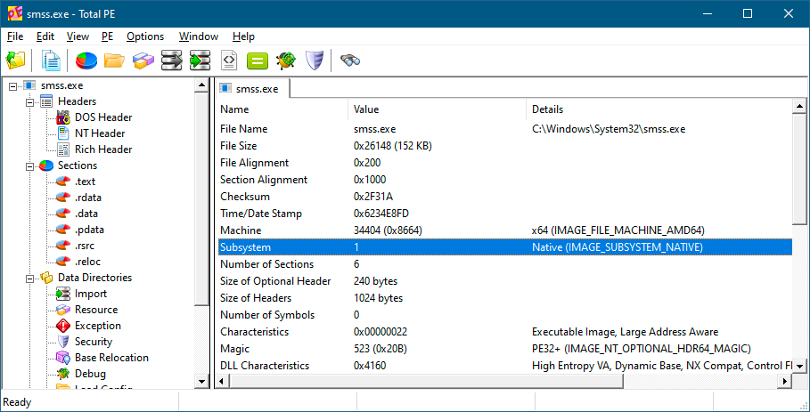 原生应用程序(Native Application)是仅依赖NtDll.Dll而不依赖其他任何动态链接库(DLL)的应用程序。典型示例是会话管理器(session manager)Smss.exe,它是系统中创建的第一个用户模式(user-mode)进程。图3-4显示它属于原生子系统(Native subsystem),子系统值为1,本质上相当于没有子系统。查看其导入依赖,NtDll.Dll是唯一的依赖项(图3-5)。