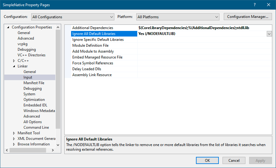 - 导航到**“链接器(Linker)”** -> **“输入(Input)”**节点,将“忽略所有默认库(Ignore all Default Libraries)”设置为“是(Yes)”。同时,添加