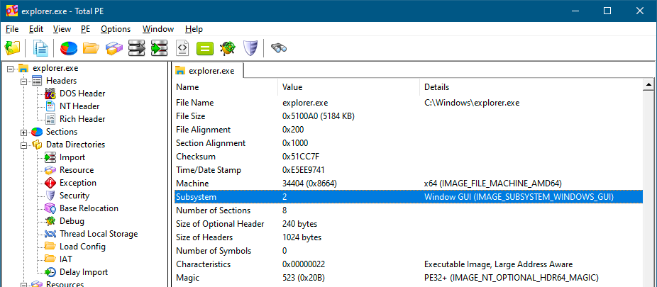 查看普通可移植可执行文件(Portable Executable,PE)的头部(例如Explorer.exe、Notepad.exe以及前几章的示例),会发现它们属于Windows子系统(Windows Subsystem)。控制台应用程序的子系统值为3(图3-1),图形用户界面(GUI)应用程序的子系统值为2(图3-2)。