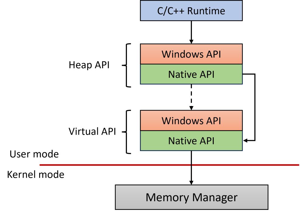 用户模式(user-mode)中有多个层级的内存 API。最底层是所谓的“虚拟函数(Virtual functions)”,它们功能最强,因为最接近内存管理器。这些函数提供了内存管理器的全部功能,例如提交(committing)和保留(reserving)内存、修改保护属性(changing protection)、使用大页(using large pages)等。其缺点是始终以页为单位工作。例如,若使用这些函数之一分配 100 字节,实际会获得 4KB(一个页的大小);若分配 5KB,实际会返回 8KB。