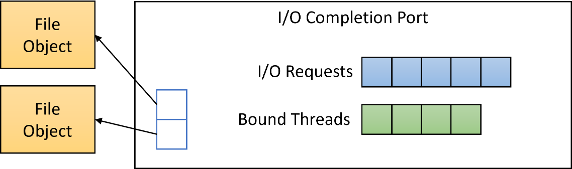 I/O 完成(端口)对象(I/O completion (port) objects)是一种在异步 I/O 操作(asynchronous I/O operations)完成时调用处理程序(handlers)的方式。有多种方法可以知道异步 I/O 操作何时完成,例如使用许多 I/O 函数提供的(可选)事件句柄(event handle)。I/O 完成对象提供了最高效的方式,它允许多个线程响应 I/O 完成事件,并且可以选择性地利用线程池(thread pool),线程可以从线程池中获取已完成的操作并运行处理程序。