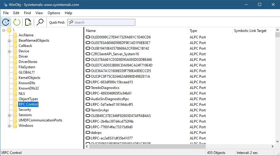 由于服务器连接端口是命名的,因此可以通过 WinObj、Object Explorer、Process Explorer 等工具查看。图 10-1 显示了在 WinObj 中查看的 RPC Control 对象管理器目录(object manager directory)中的多个 ALPC 端口对象。