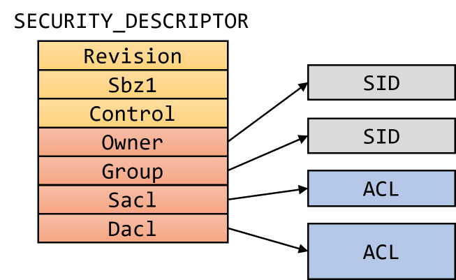 安全描述符(security descriptor)用于保护各类内核对象。安全描述符的核心元素包括对象的所有者SID(默认情况下为创建者的SID)和自主访问控制列表(Discretionary Access Control List,DACL)——后者指定了谁可以对该对象执行何种操作。