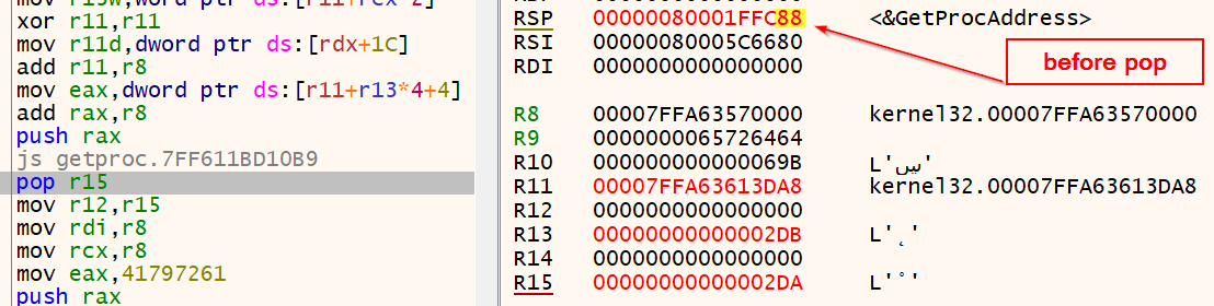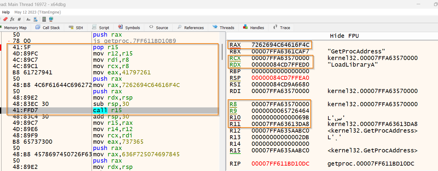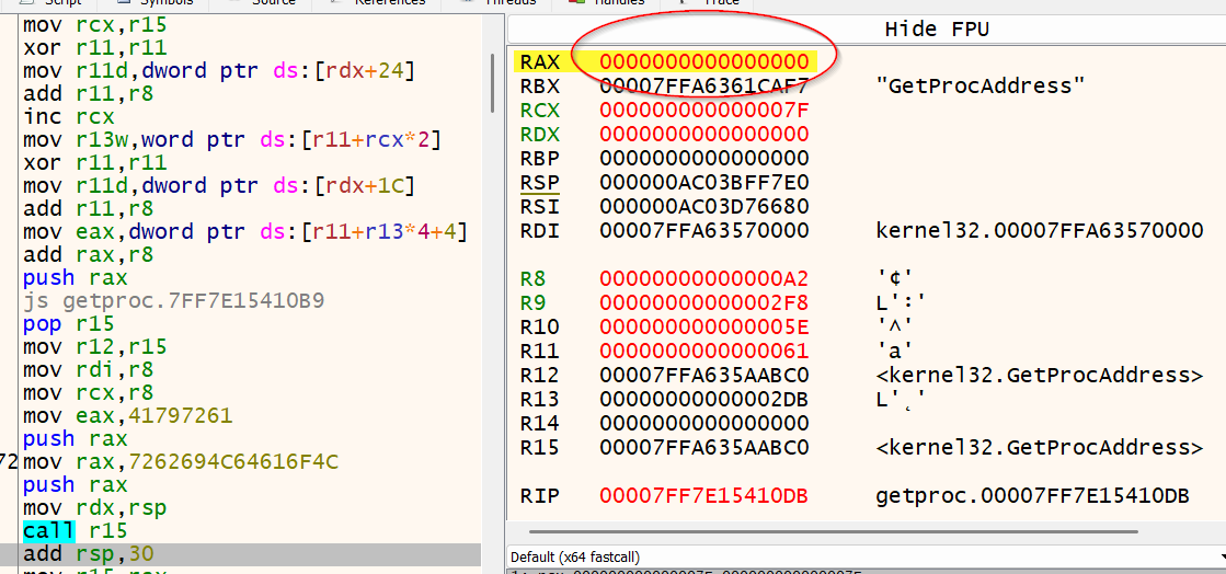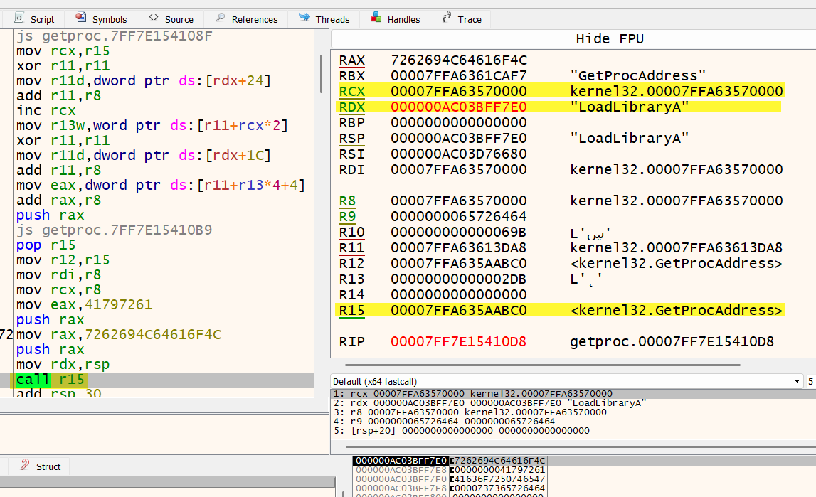 RCX存放着kernel32的基地址,RDX存放着指向我们的"LoadLibraryA"字符串的指针,而 R15存放着GetProcAddress的地址: