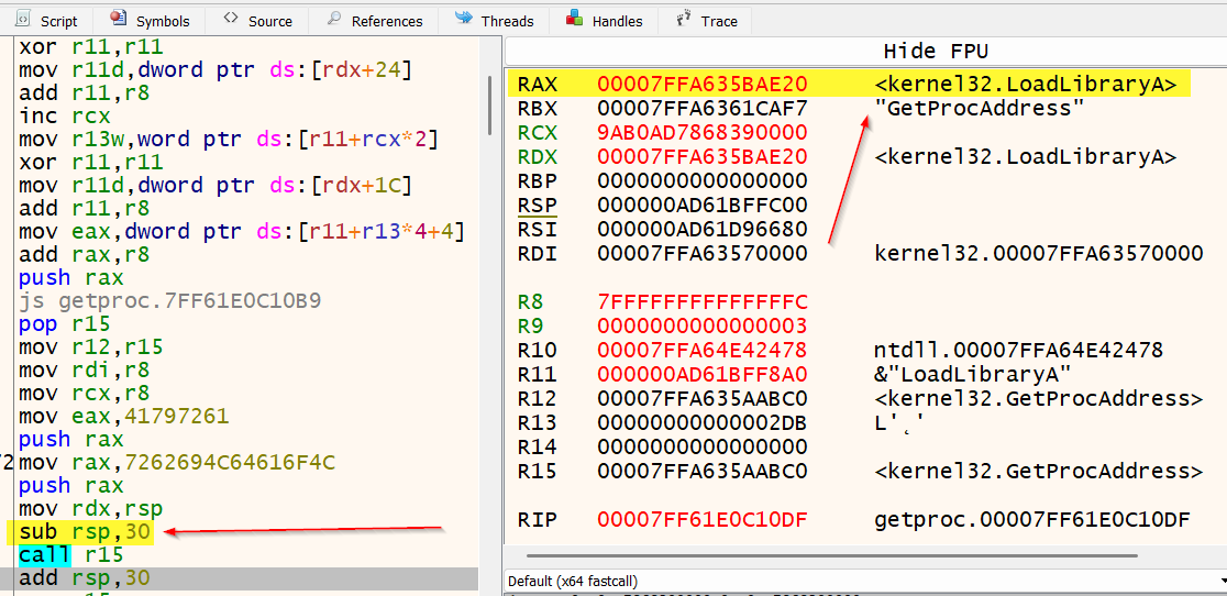 中啦! 就在这儿,如我们所愿找到了LoadLibraryA这个Windows API的地址。 就在那里,在RAX寄存器中热切地等待着我们。 你还会看到我们对影子空间堆栈的调整: