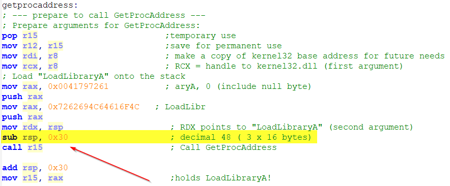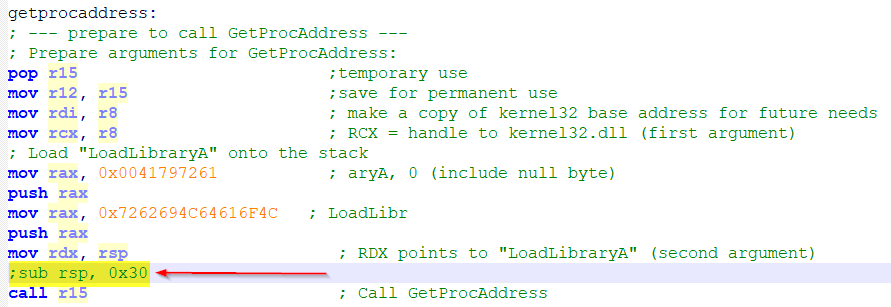 sub rsp, 0x30 ;I'll explain this in greater detail later. It involves shadow space/16 byte stack alignment