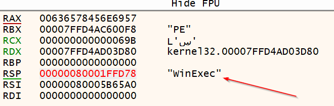 当我们push rax时,会看到熟悉的WinExec字符串,并且可以在shellcode中不包含NULL值的情况下满足保留它的需求。